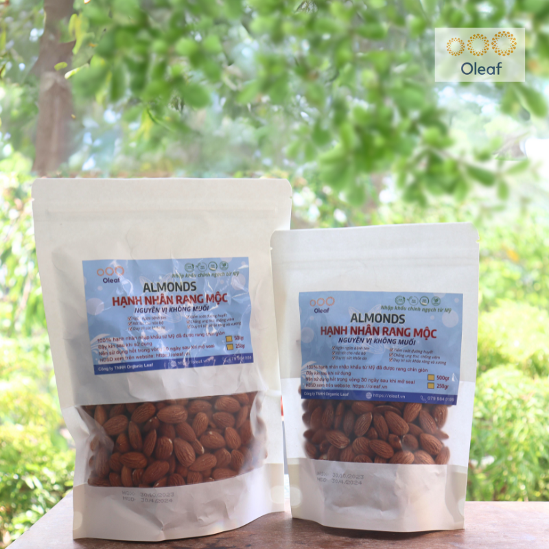 Hạnh nhân OLEAF có hai loại: Sống và rang mộc nguyên vị không muối cho khách hàng lựa chọn
