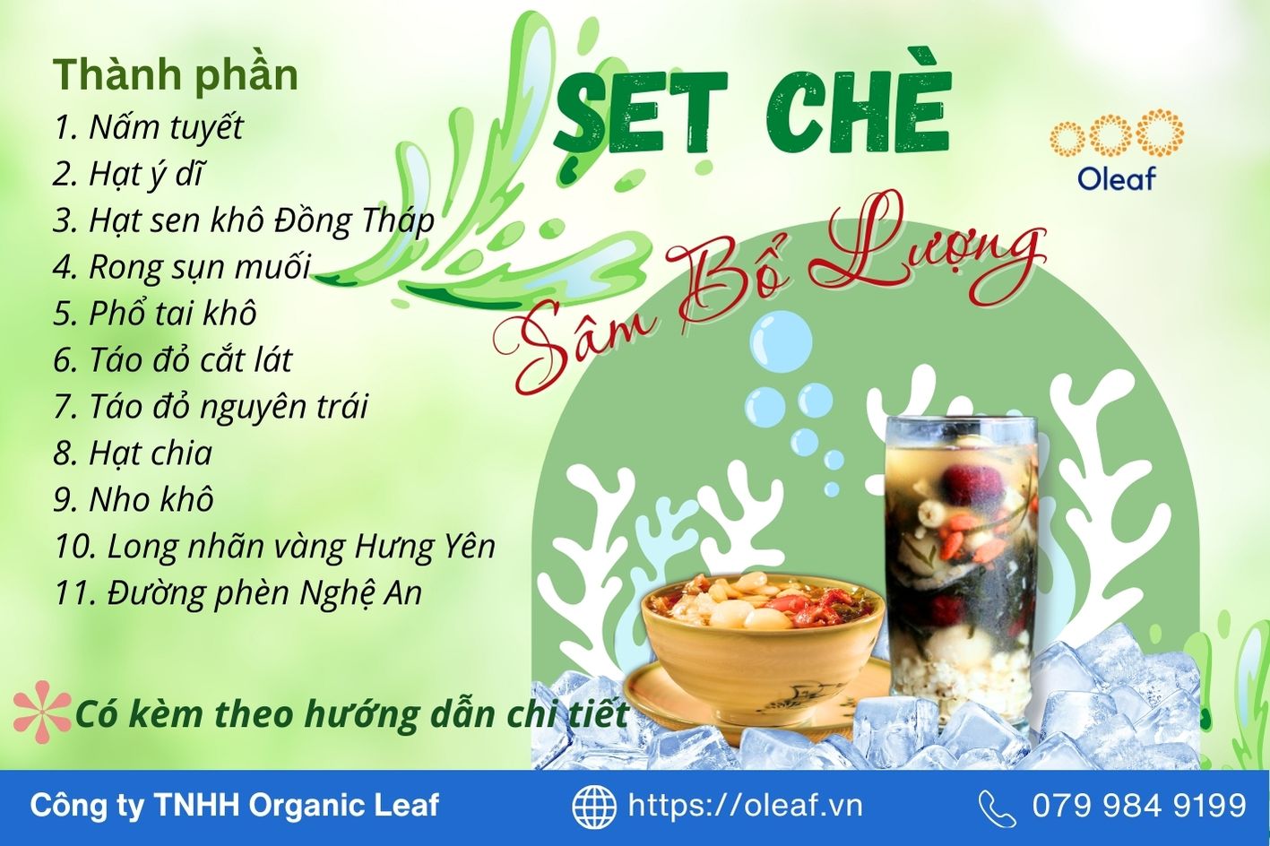 Oleaf đã nghiên cứu, cân đối và đặc biệt tuyển chọn set sâm bổ lượng với các nguyên liệu chất lượng cao, nguồn gốc rõ ràng, sạch, không những giúp cơ thể được giải khát sảng khoái mà còn có tác dụng thanh lọc giải độc, dưỡng nhan đẹp da, ngủ ngon, giảm stress, tinh thần tỉnh táo.